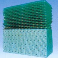 特點:折波型的板面加強了水流和空氣和擾流,其散熱面積增長系數(shù)較大。板面上圓錐形突出件,既起保持片距的作用,又能使片體之間落下的水流層濺散成細小水滴,使這種填料具有點滴薄膜式性能,增加散熱面積,提高冷卻效果。